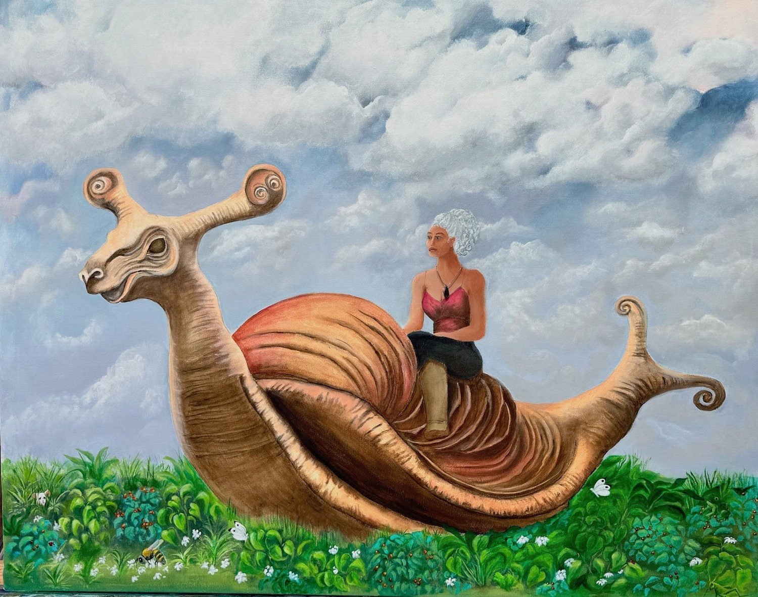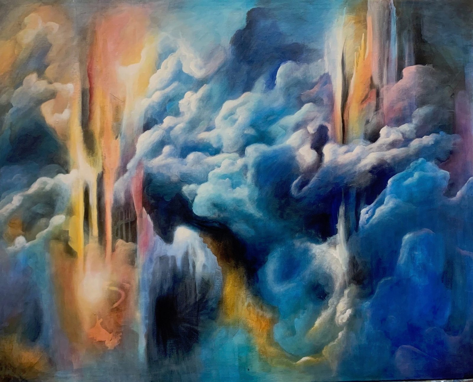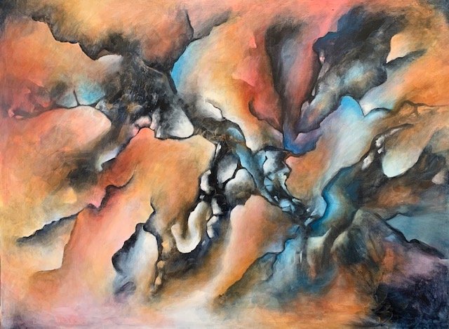 My life has followed two parallel tracks. Professionally, I’ve had careers focused on service work: nursing, psychotherapy, Hakomi (Somatic Psychotherapy) Teacher. At the same time, I’ve followed a variety of artistic paths to express my vision of the inner human world, of nature and and our interaction with the world around us through photography, oil painting, ceramics, sculpting, pastels, acrylic painting and collage. Abstract painting was a surprise to me. It is as though an invisible thread pulled me through everything I have painted from oil to acrylic to oil again, from otherworldly abstract cloud-like landscapes to allegorical images. I love all the possibilities.