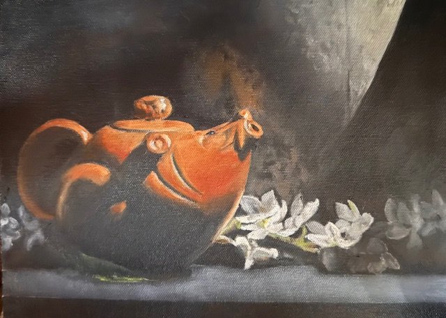 Immersing myself in acrylic has been a homecoming. I fell in love with the spontaneity of abstract, like unveiling a secret unknown to even the artist. Many of these paintings spilled out like a birth, forming themselves into otherworldy lifescapes. Those paintings reveal a combination of serenity and tumultuousness, alive and full of movement and all coming together like poetry. Recently, however, I enrolled in an Art Academy and am now doing the absolute opposite: oil realism.